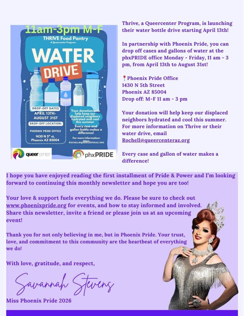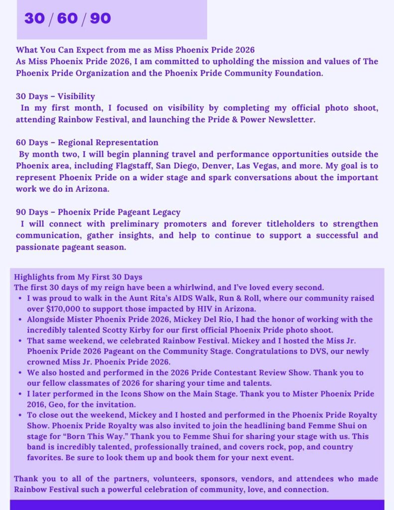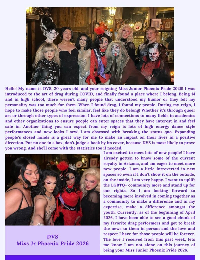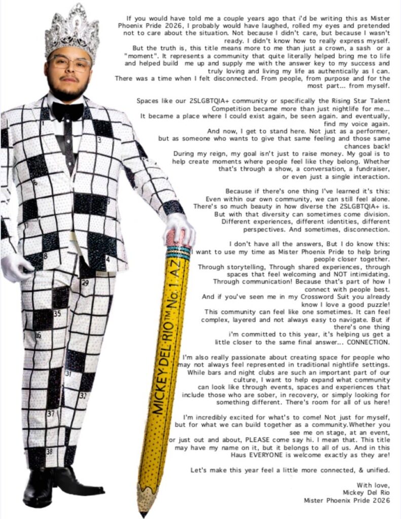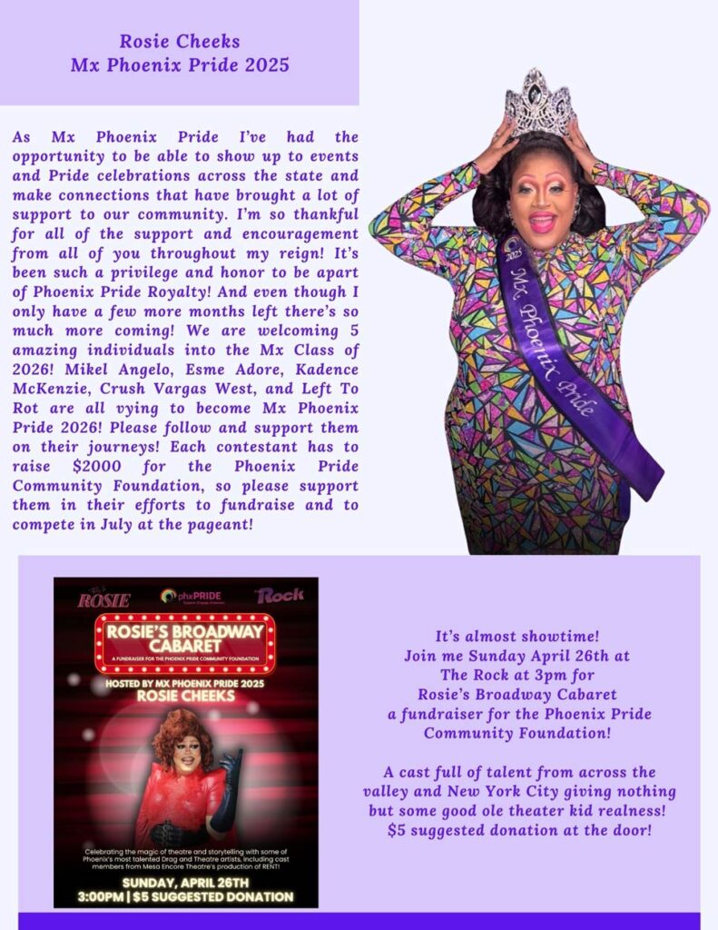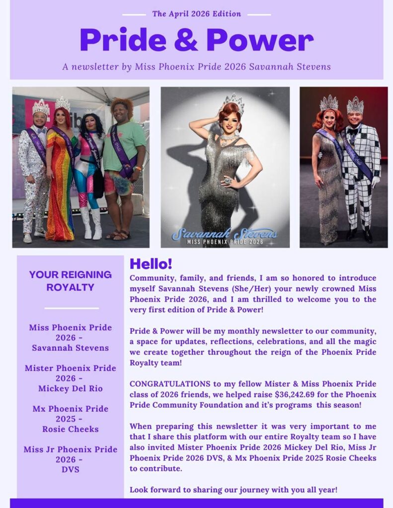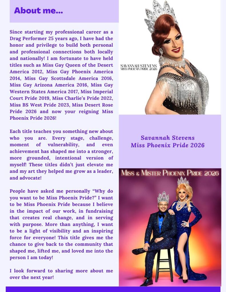 Contestants will compete in a series of judged categories designed to highlight their unique strengths and commitment to the values of Phoenix Pride. Beyond the crown, the winners will serve as ambassadors throughout the year, attending events and supporting initiatives that uplift and empower the community. The Miss and Mister Phoenix Pride Pageant is more than a competition—it’s a platform for advocacy, celebration, and unity, where grace meets grit in the spotlight of pride.